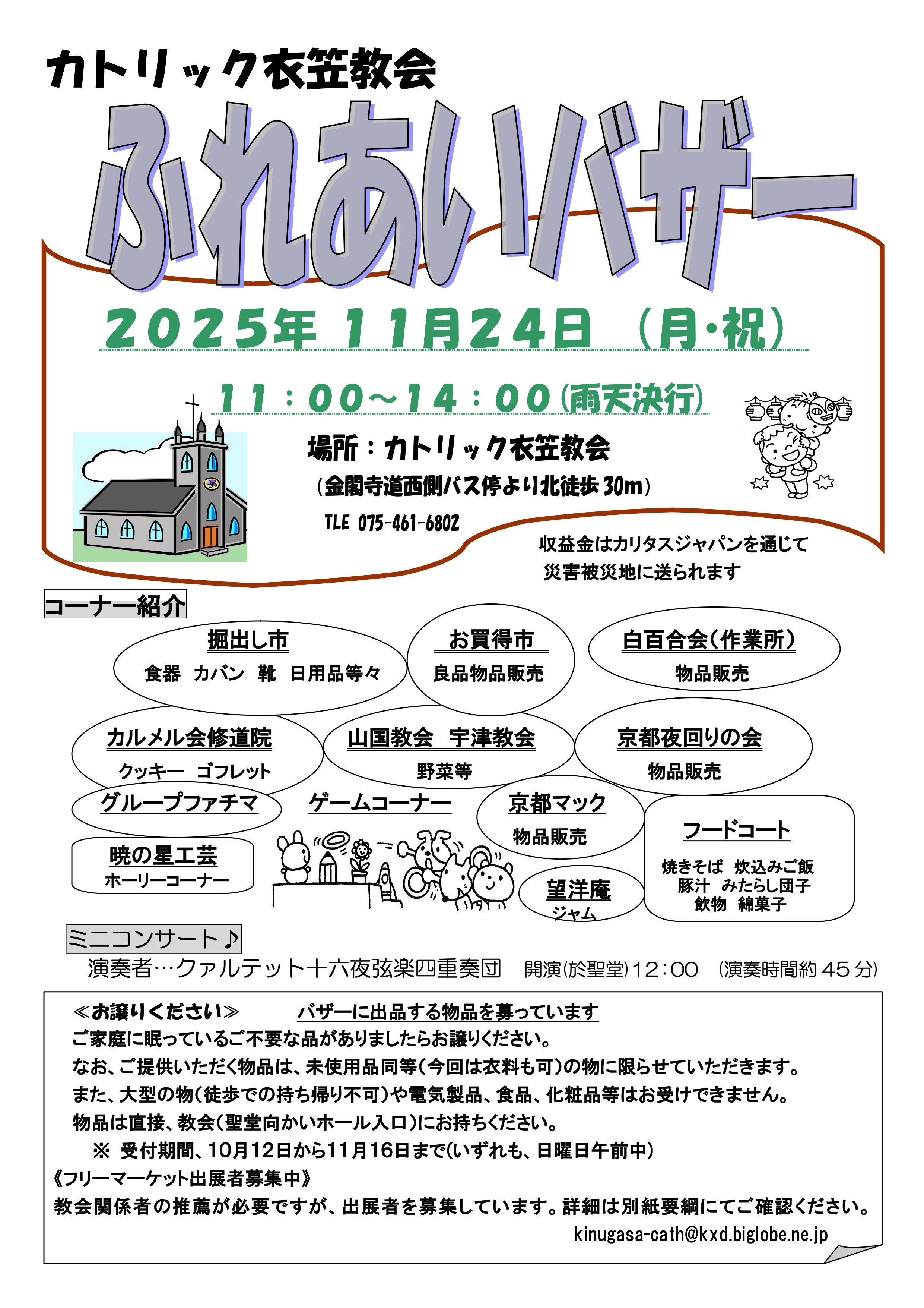 ・11月24日(月・振替祝)教会バザー 11時~14時 ・12月20日(土)午後 クリスマスコンサート オルガン桑山彩子さん